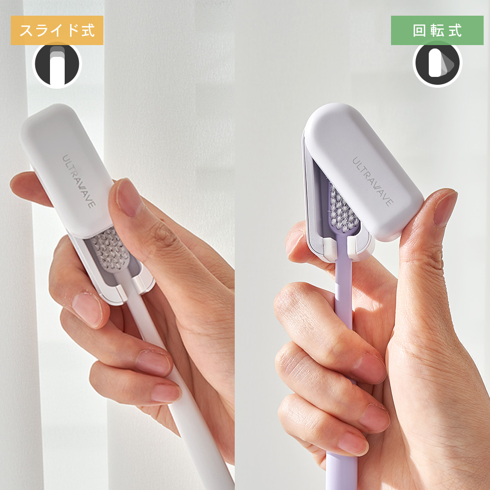 UVの除菌光がとどかない歯ブラシの柄の部分は露出して乾燥を促し、ブラシ部のみに集中してUVを照射して除菌します。