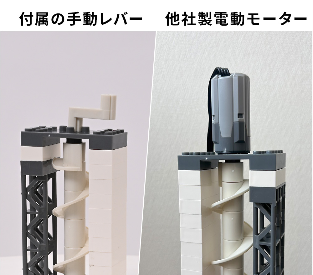 この製品は、単体でも十分に楽しめる構造でありながら、各社のブロックと互換性のある寸法設計になっているため、昔遊んでいたブロックと組み合わせて使うことができます。