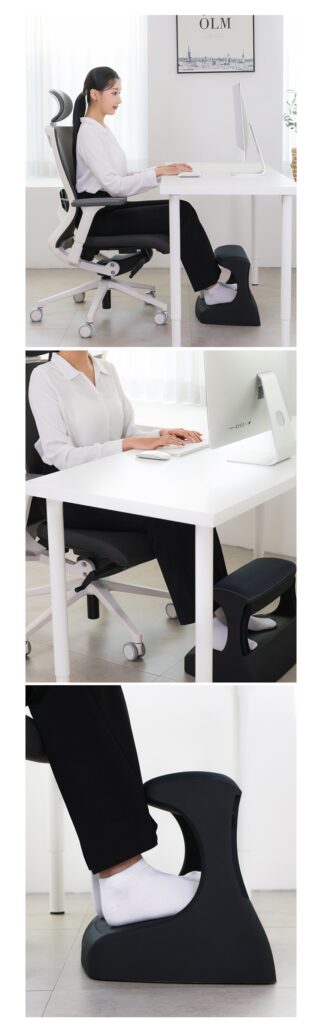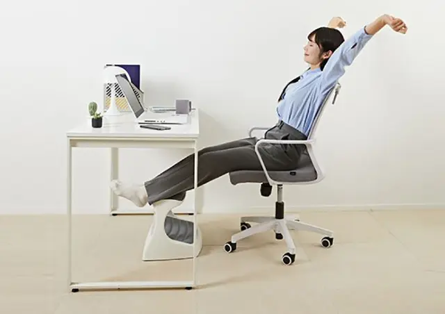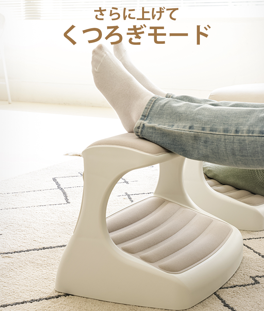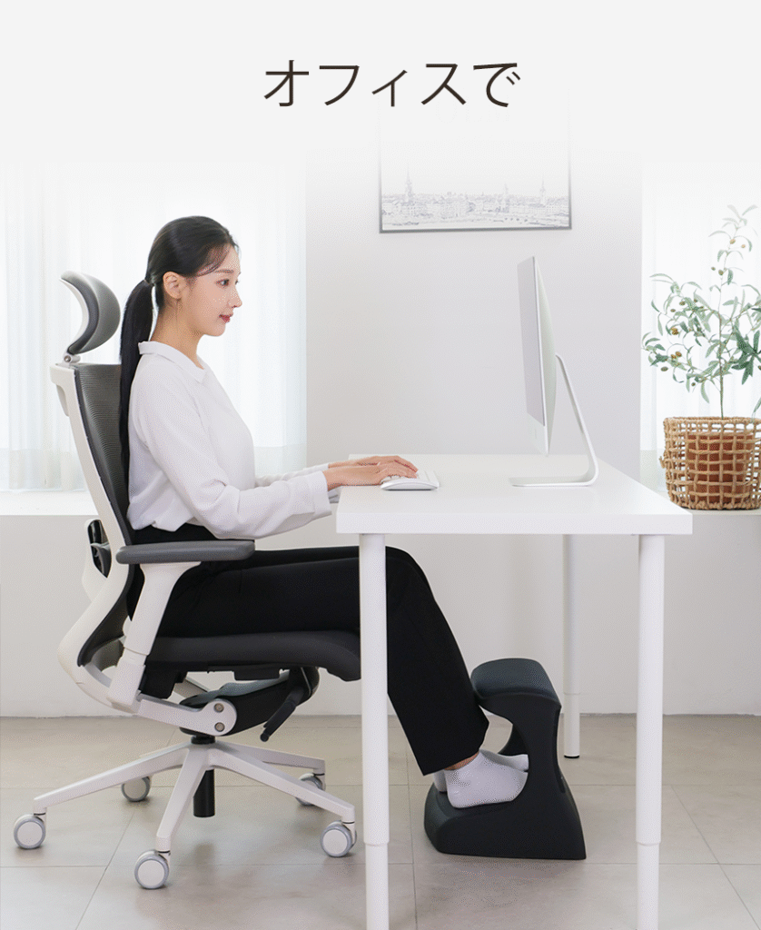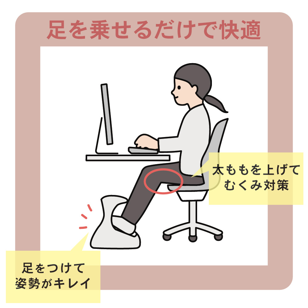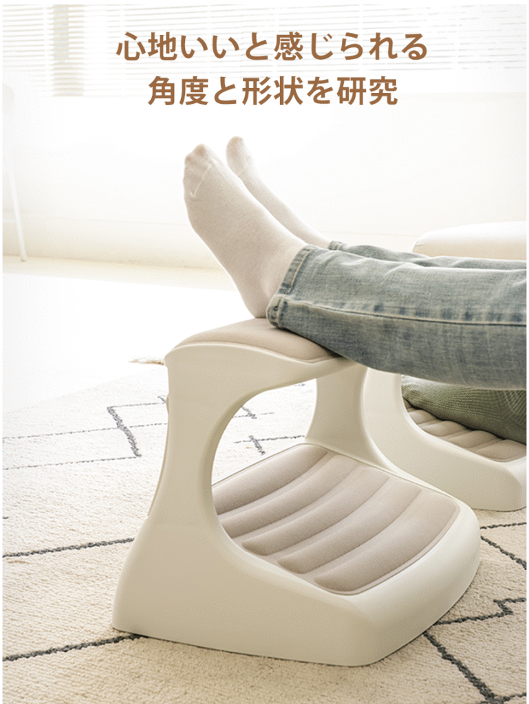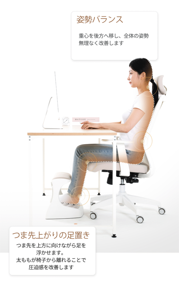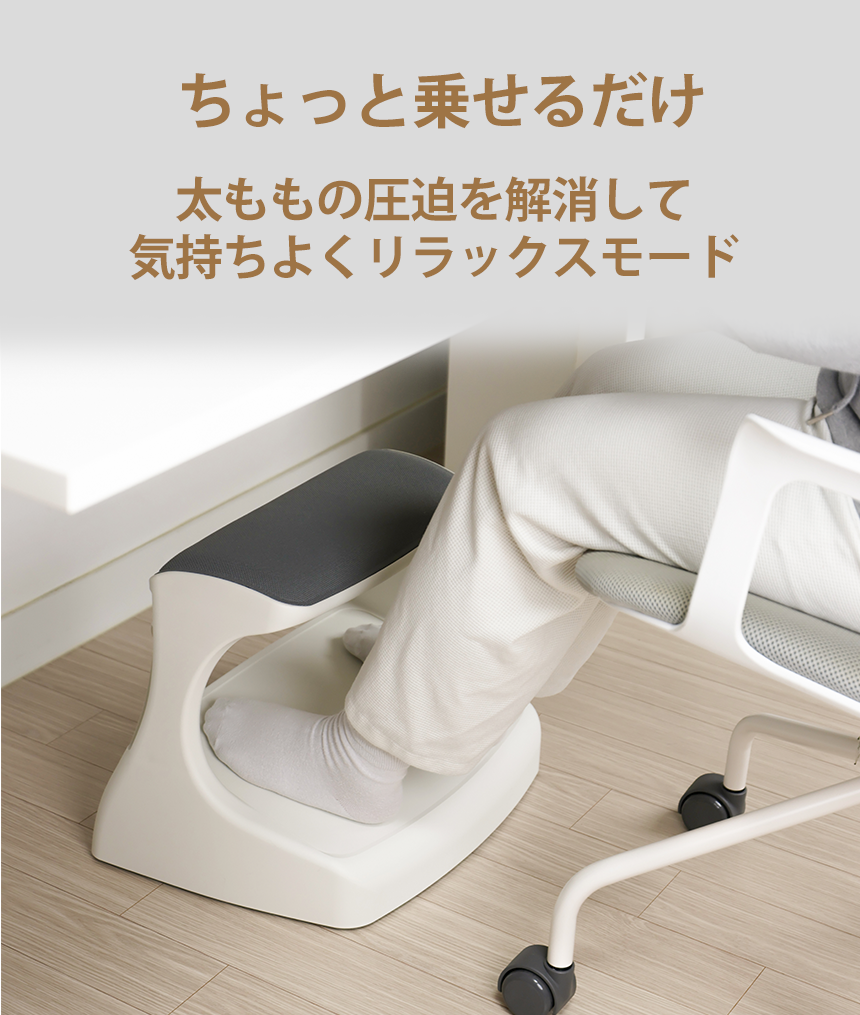 つま先がちょっと上げて足を置けば太ももの圧迫を解消して長時間の着座をサポートします。