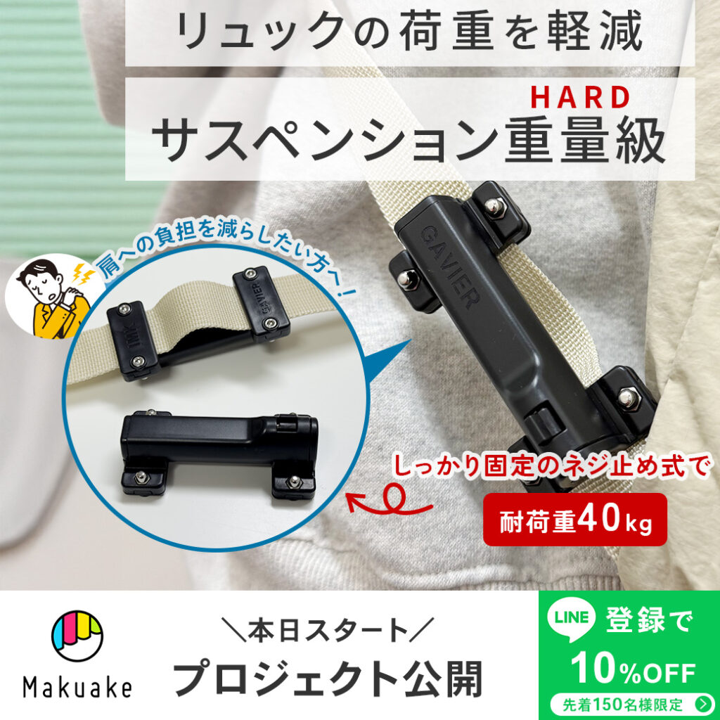リュックの荷重を軽減するリュックのサスペンション重量級用HARDby FFに Uncategorizedon 投稿日: 2026-01-232026-02-05 MAKUAKEプロジェクト https://www.makuake.com/project/beetle30