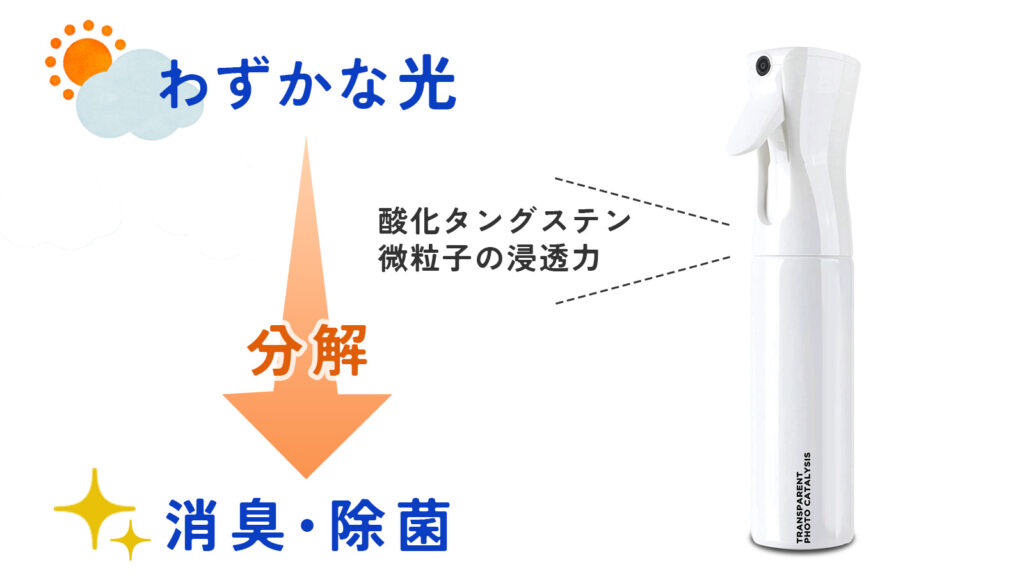 本製品の光触媒は主成分に酸化タングステンWO3を使用して紫外線以外の蛍光灯やLEDなどの僅かな光でも分解が可能な光触媒を開発しました。