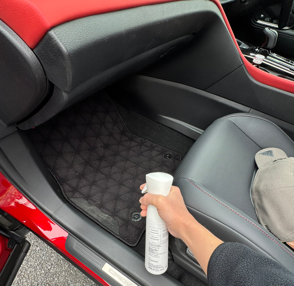 【ハンドルやダッシュボードへは噴霧後、タオルで拭く】